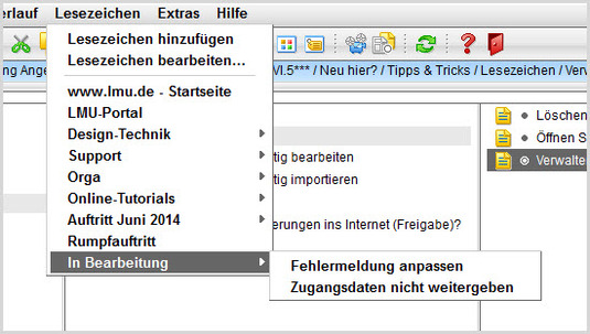 - Öffnen Sie die Bearbeitung der Lesezeichen über Lesezeichen > Lesezeichen bearbeiten.